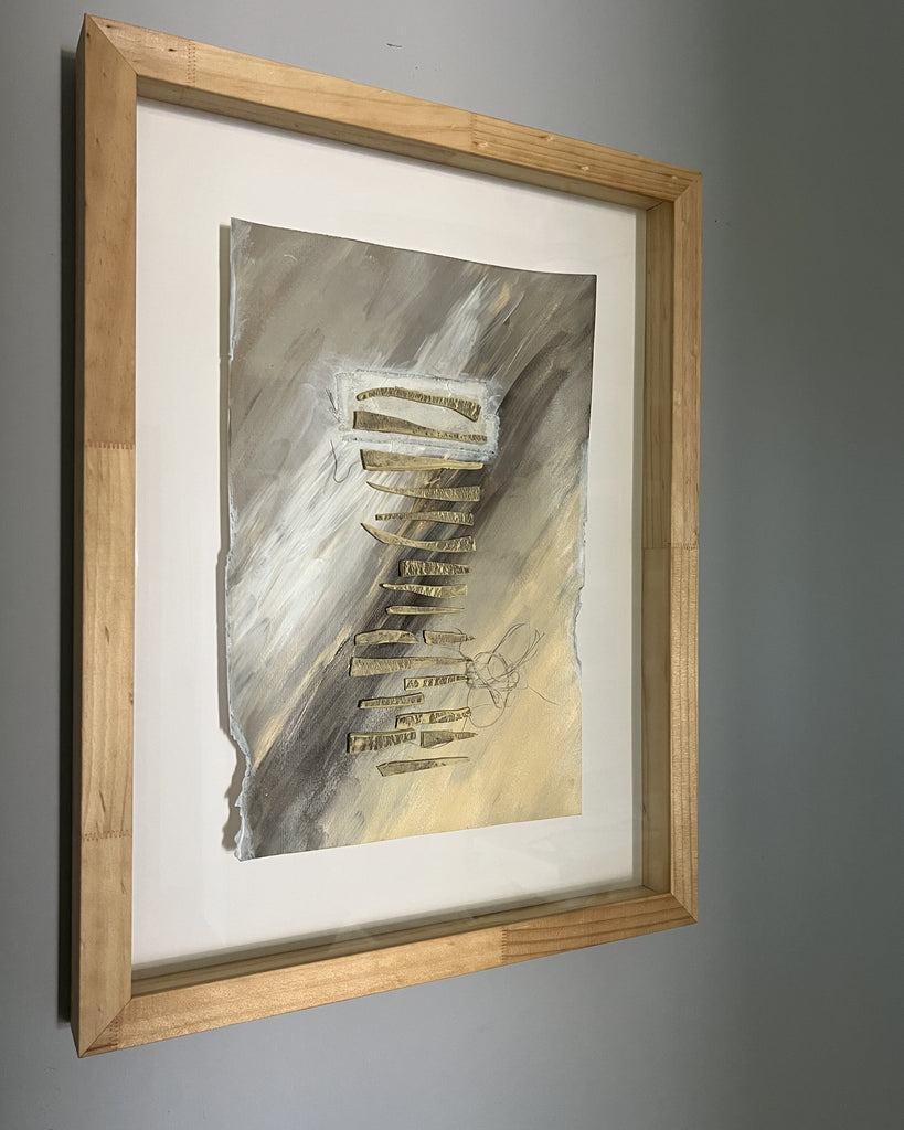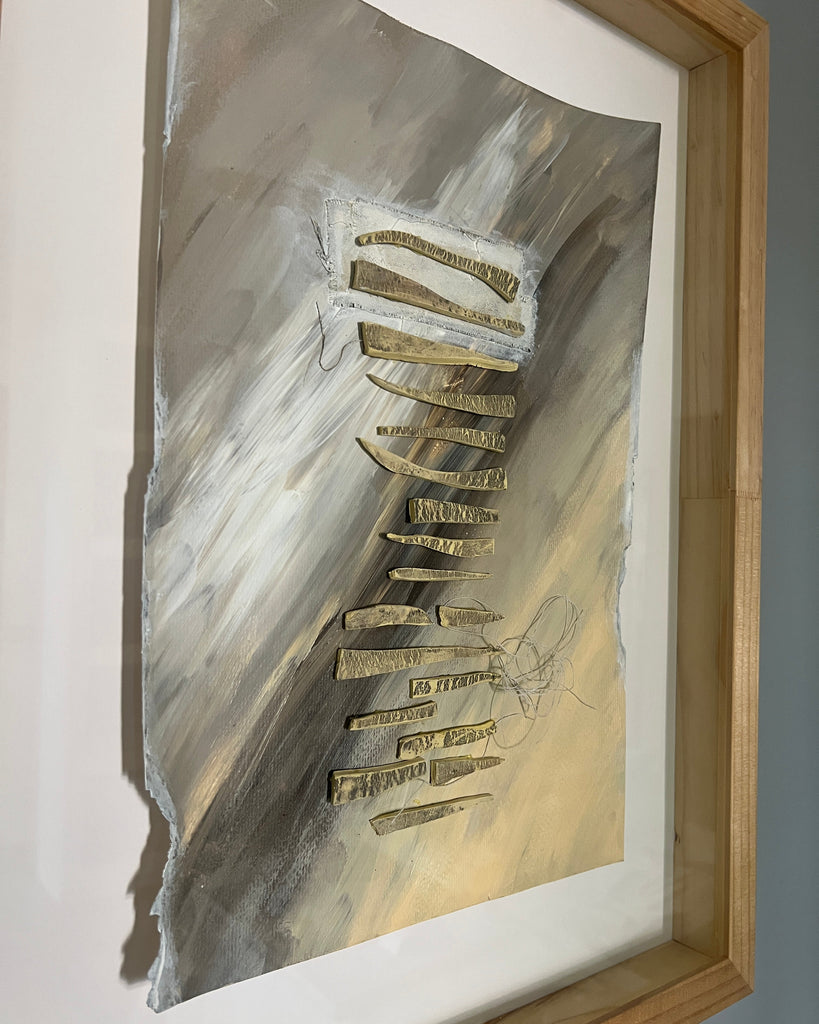 An oil painting enriched with textiles and ceramics, featuring a distinctive striated effect. The work metaphorically represents the stages of life and how each one constructs a unique and unrepeatable narrative. Created in 2023 and presented in a professional 47 x 61 cm box frame, this singular piece merges traditional painting techniques with ceramic and textile elements, generating a composition of profound artistic character that invites reflection on one's personal journey.