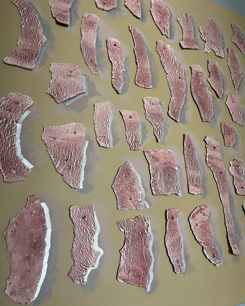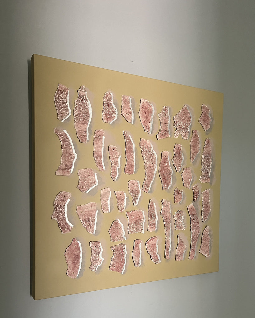 Language of Sections is a unique ceramic work created entirely by hand in 2024. It combines striated ceramic pieces on acrylic canvas, creating a 60 x 60 cm composition that transcends mere decoration. The piece constitutes a visual allegory of existence: each section represents a different segment of life, where each step contributes to the construction of a unique and unrepeatable trajectory. Its singular nature makes it an artistic statement on the fragmented and progressive nature of human experience.